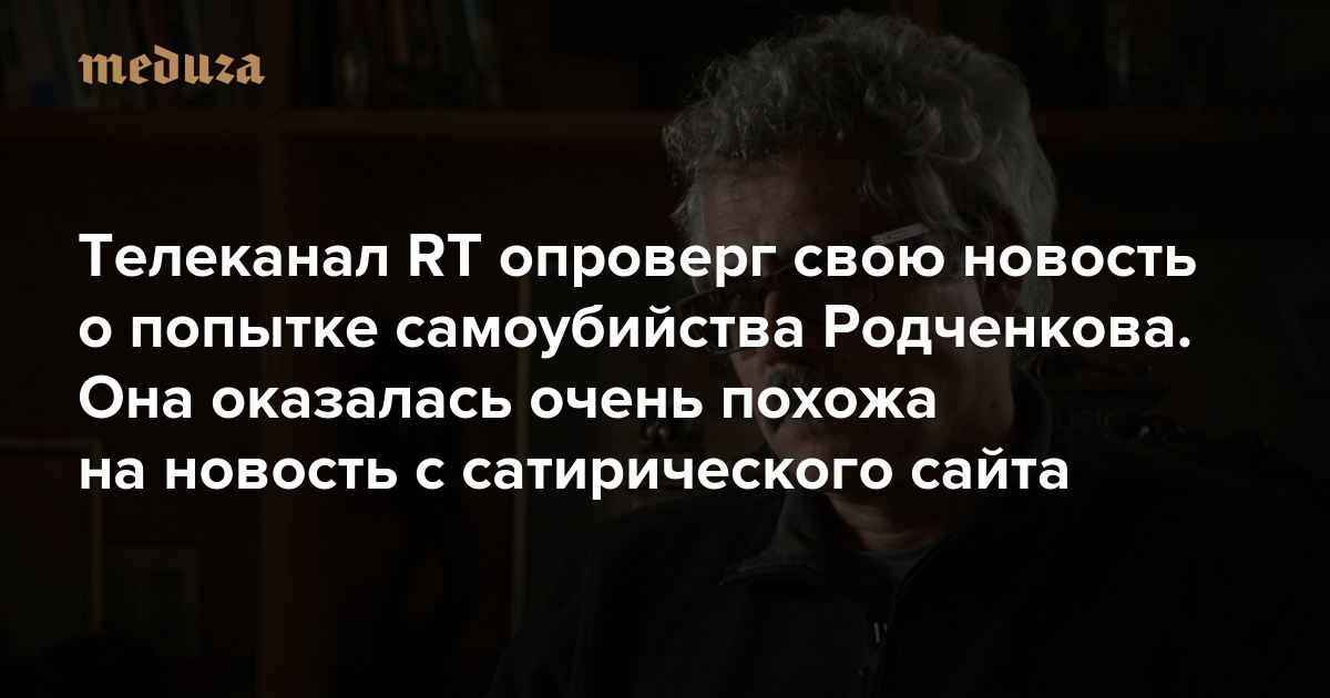 Телеканал RT опроверг свою новость о попытке самоубийства Родченкова. Она оказалась очень похожа на новость с сатирического сайта