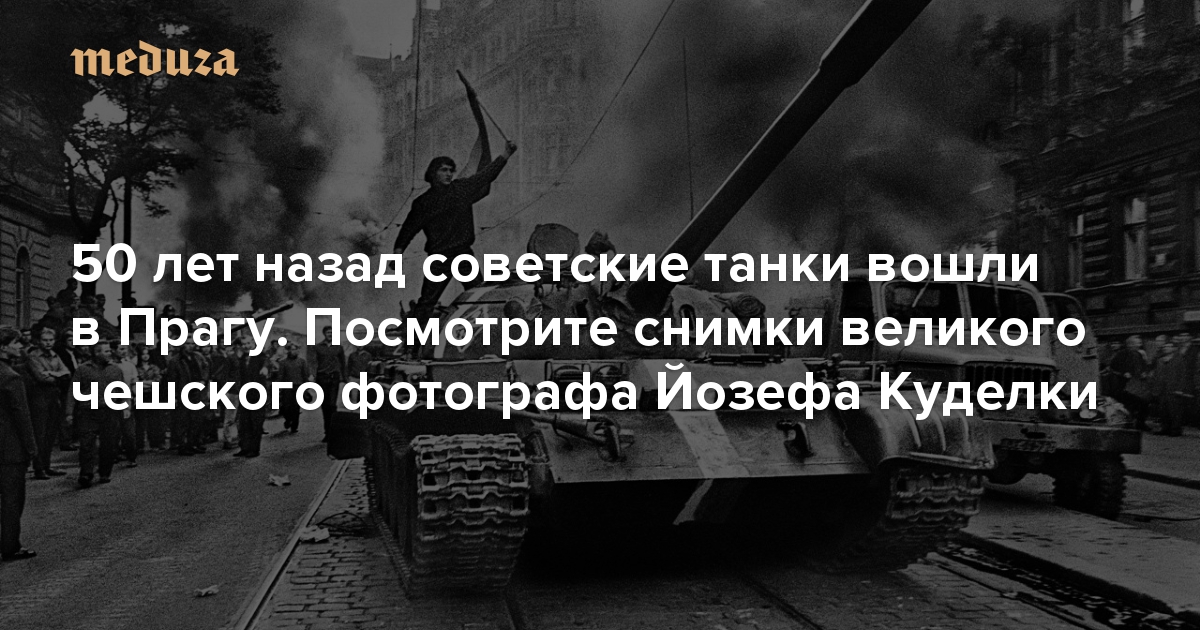 Ровно 50 лет назад, в ночь на 21 августа 1968 года, советские войска (вместе с войсками нескольких других стран Варшавского договора) вошли в Чехословакию. Так закончилась «Пражская весна» — попытка Александра Дубчека и других лидеров Чехословацкой компартии либерализовать просоветский режим. В день ввода войск 30-летний чешский фотограф Йозеф Куделка был в Праге — за год он решил бросить карьеру инженера ради фотографии; журналистом он никогда не работал. Фотографии, которые Куделка сделал в те дни, стали главным визуальным символом советской агрессии: вскоре их вывезли из страны и опубликовали в Нью-Йорке, в целях безопасности не называя имени автора снимков. На следующий год Куделка (все еще анонимно) получил одну из самых престижных фотографических наград — золотую медаль Роберта Капы, а в 1971 году стал участником фотокооператива «Магнум», основанного Капой и Анри Картье-Брессоном. «Медуза» публикует фотографии, которые Куделка сделал в Праге во время советского вторжения.