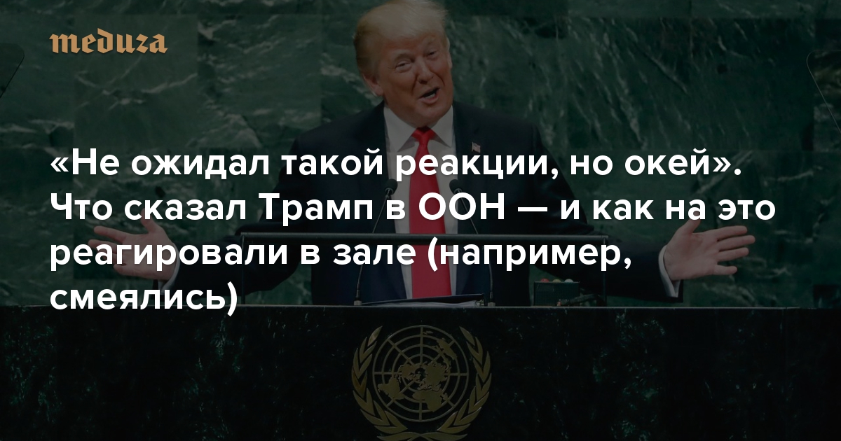 Дональд Трамп выступил на ежегодной сессии Генеральной ассамблеи ООН в Нью-Йорке. Он подвел итоги первых полутора лет пребывания на посту президента США (которые оценил очень высоко) и обозначил свои внешнеполитические приоритеты. В зале присутствовали многие мировые лидеры; услышав некоторые слова Трампа, они смеялись. «Медуза» выбрала главное из выступления президента США.