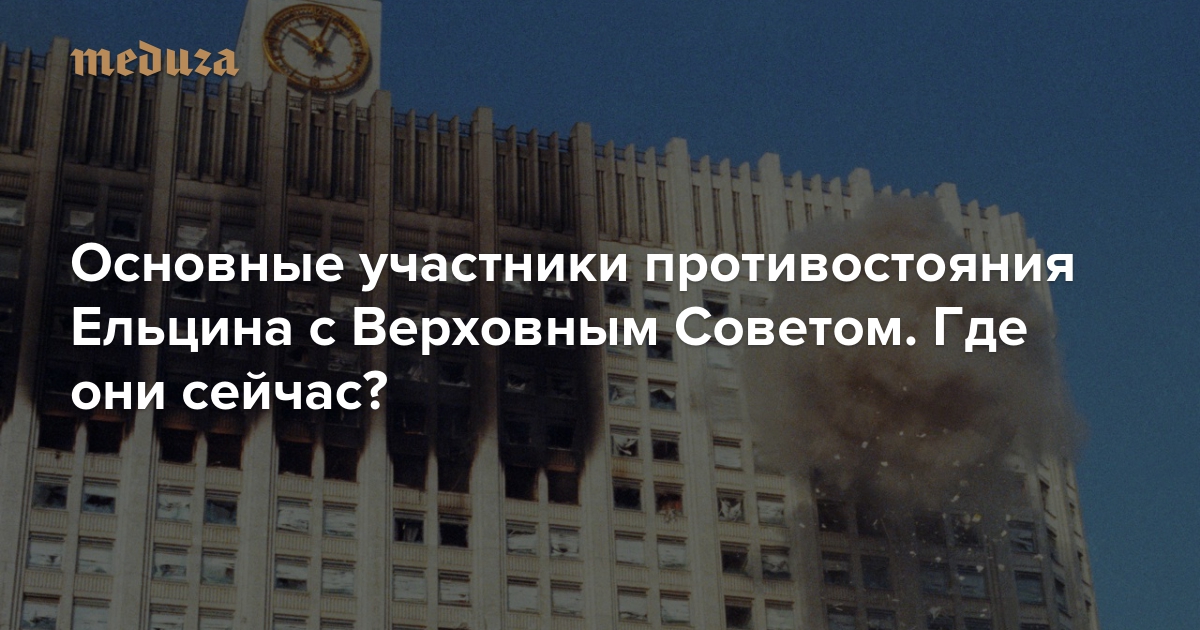 3 и 4 октября 1993 года политическое противостояние президента Бориса Ельцина с вице-президентом Александром Руцким и председателем Верховного совета Русланом Хасбулатовым закончилось вооруженными столкновениями в Москве. Конфликт начался в декабре 1992 года — Съезд народных депутатов во главе с Хасбулатовым пытался поправками в конституцию РСФСР уменьшить полномочия президента, а Ельцин отвечал указами, укрепляющими его власть. 21 сентября 1993-го Ельцин подписал указ № 1400 о роспуске Верховного совета. Большинство депутатов во главе с Хасбулатовым отказались подчиняться и забаррикадировались в Доме советов, в здании, где сейчас находится правительство РФ. 3 октября начались столкновения, сторонники ВС прорвали осаду Белого дома и пытались захватить телецентр в Останкино. 4 октября верные Ельцину войска взяли Дом советов штурмом. В эти два дня в столице погибло 124 человека, 348 получили ранения. После победы Ельцина была принята современная Конституция с очень большими полномочиями у президента и с урезанными — у парламента. Спустя 25 лет после этих событий «Медуза» вспоминает некоторых главных их участников с обеих сторон.