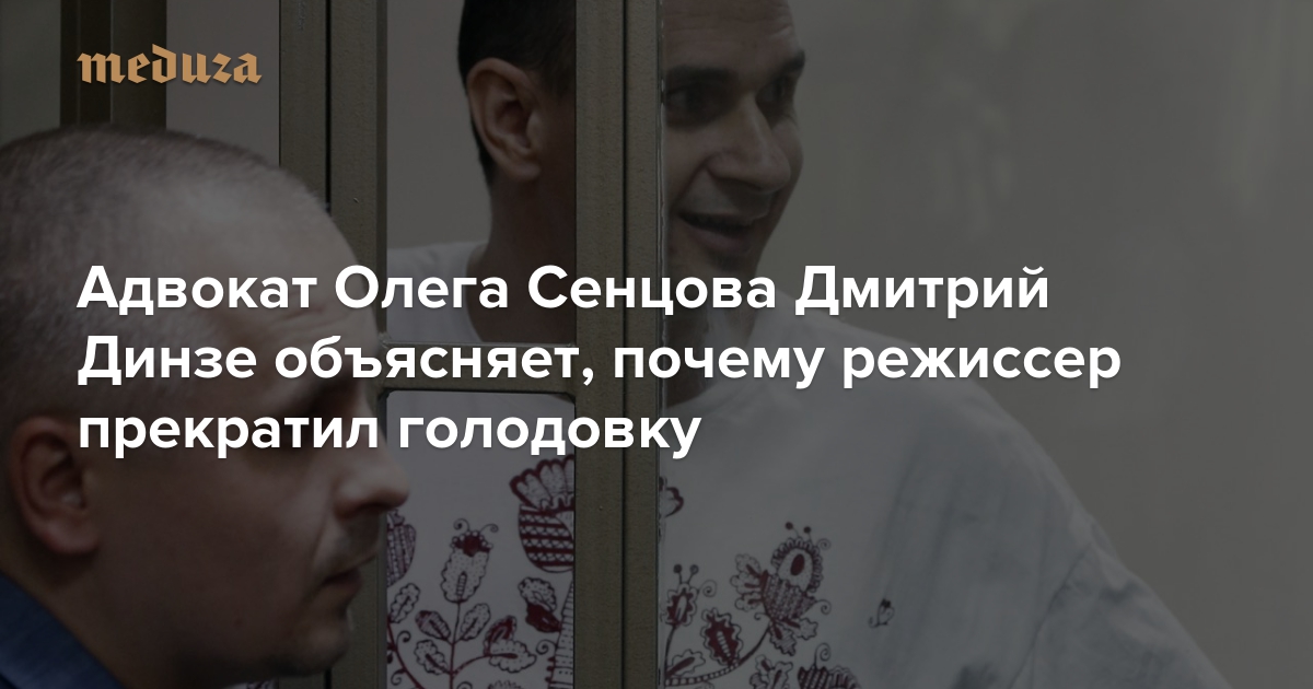 5 октября украинский режиссер Олег Сенцов заявил, что вынужден прекратить голодовку — иначе его переведут на принудительное кормление. Об этом Сенцов сообщил в своем обращении, переданном через адвоката Дмитрия Динзе. Сенцов, которого приговорили к 20 годам тюрьмы за «подготовку к террористическому акту» и поджог двери офиса «Единой России» (он своей вины не признает), голодал с 14 мая — 145 дней, требуя освободить всех украинских политзаключенных, находящихся в российских тюрьмах. «Медуза» выяснила у Дмитрия Динзе, в каких обстоятельствах было принято решение о прекращении голодовки.