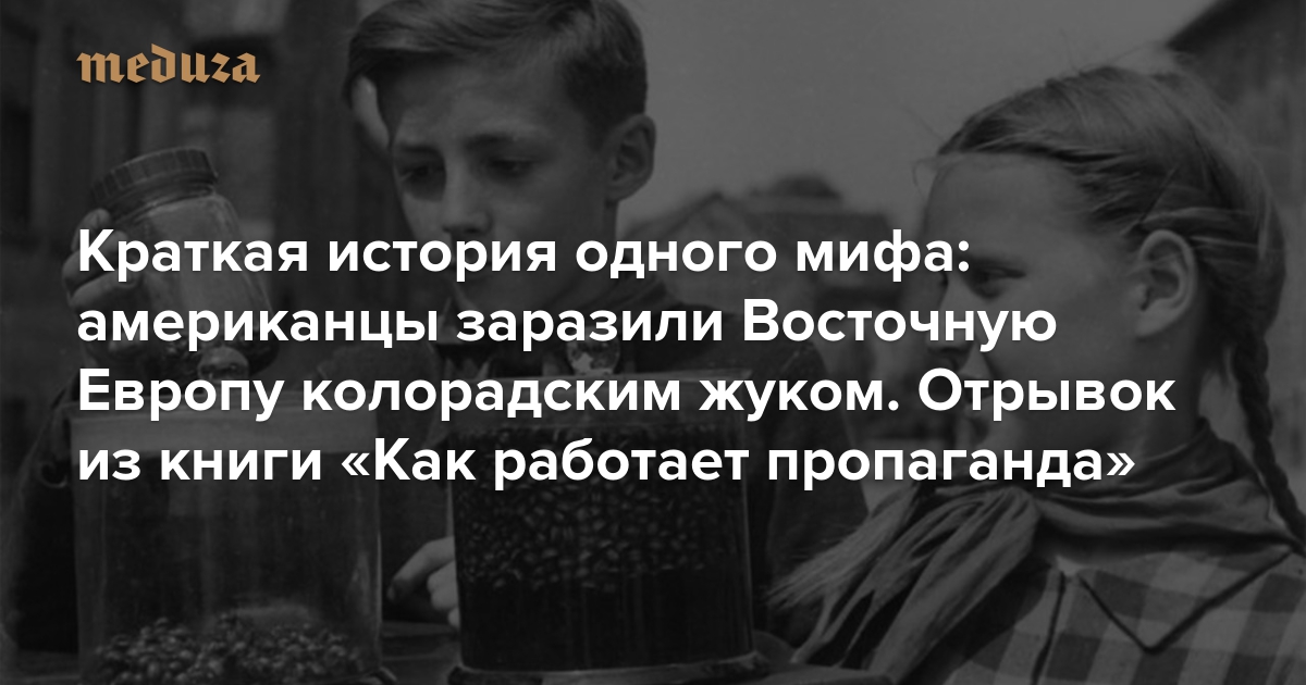 В издательстве Individuum выходит книга историка Тамары Эйдельман «Как работает пропаганда». В ней автор описывает, как устроено распространение фейковой информации, и подробно разбирает несколько примеров — от исторических («дело Бейлиса») до совсем недавних («распятого мальчика»). С разрешения издательства «Медуза» публикует отрывок из книги, посвященный колорадскому жуку — и тому, как американцы якобы специально распространяли его в Восточной Европе.
