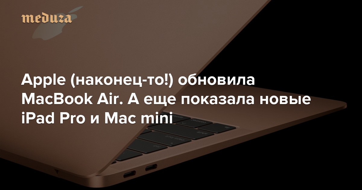 Если вам лень читать подробный обзор, вот его кратчайший пересказ: MacBook Air теперь с экраном Retina и без классических USB-портов, Mac mini просто стал мощнее (и темнее), а в iPad Pro убрали кнопку «Домой» и порт для наушников; порт Lightning заменили на USB-C. Все устройства появятся в рознице 7 ноября.