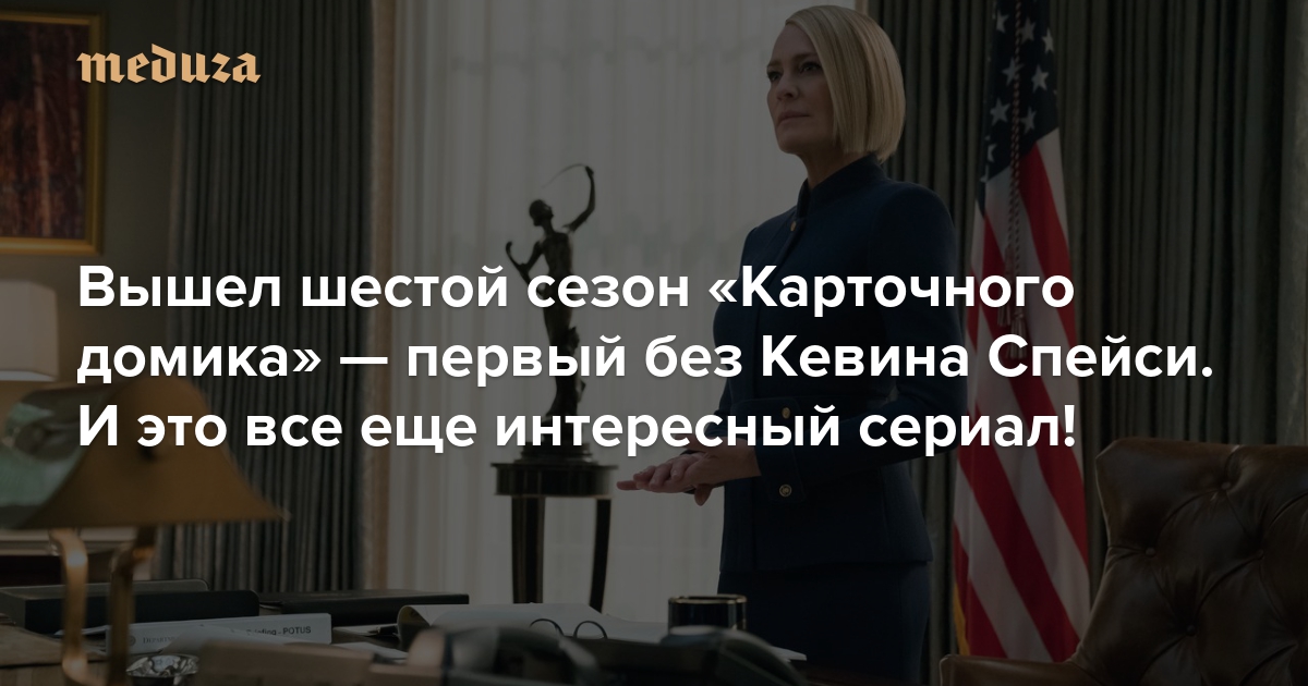 2 ноября на американском Netflix и 3 ноября в российской «Амедиатеке» выходит шестой — заключительный — сезон «Карточного домика». Кевин Спейси, сыгравший главную роль в пяти предыдущих сезонах, был отстранен от съемок в сериале после обвинений в сексуальных домогательствах. В одном из тизеров к шестому сезону показали, что его герой, бывший президент Фрэнк Андервуд, мертв. У власти осталась жена Андервуда Клэр, ее сыграла Робин Райт. По просьбе «Медузы» кинокритик Егор Москвитин до премьеры посмотрел три серии из восьми — и рассказывает, почему один Андервуд на самом деле лучше двух.