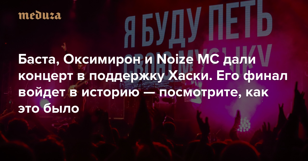Вечером 26 ноября в московском «Главклубе» прошел концерт «Я буду петь свою музыку» в поддержку рэпера Хаски. 22 ноября суд в Краснодаре дал ему 12 суток ареста за мелкое хулиганство — рэпера обвинили в том, что он, когда ему не дали провести концерт, отключив в клубе электричество, залез на автомобиль и читал свои треки оттуда. Концерт был организован Оксимироном, к которому присоединились Баста и Noize MC, билеты раскупили еще в субботу за несколько часов. Незадолго до концерта стало известно, что Хаски освободили из-под ареста, — что не помешало выступлениям состояться. «Медуза» рассказывает и показывает, как это было. Трансляцию концерта вел телеканал «Дождь»; большинство видео — из его эфира.