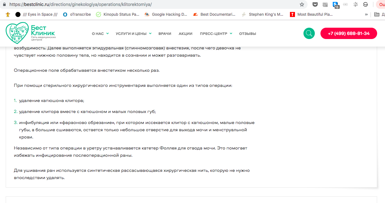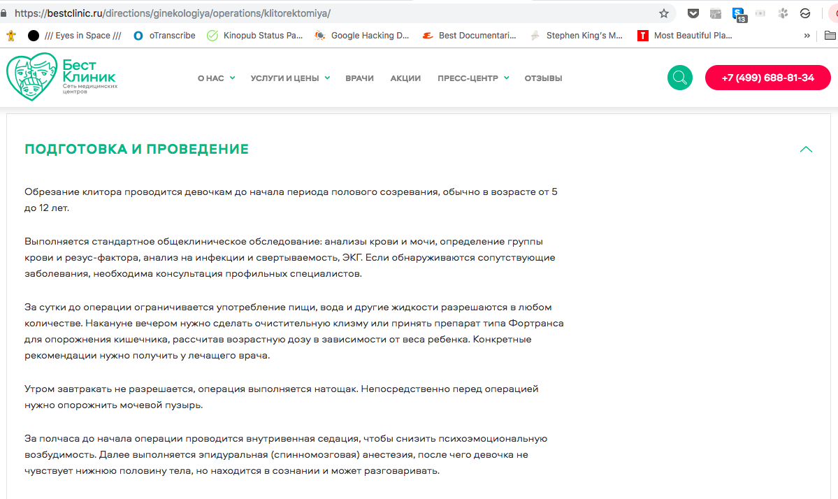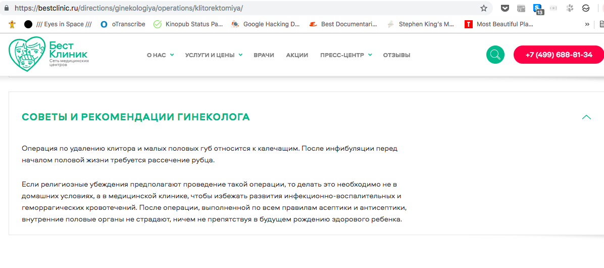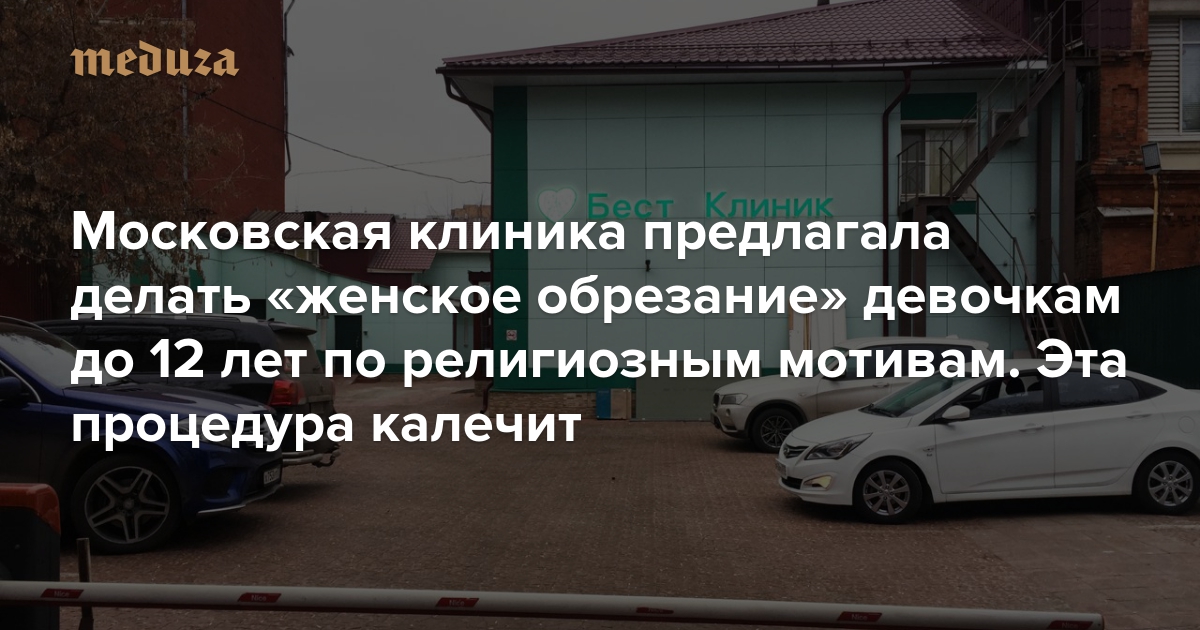 Среди прочих услуг на сайте клиники «Медуза» обнаружила клиторэктомию — операцию по так называемому «женскому обрезанию». «Медицинских показаний для этой операции нет, вмешательство проводится по религиозным или ритуальным мотивам», — сообщал сайт центра и добавлял, что, поскольку операция является «калечащей», делать ее «необходимо не в домашних условиях, а в медицинской клинике». («Бест Клиник» — это сеть, но такая услуга была только на сайте центра на «Бауманской»; он принадлежит компании «Классикус», которой владеют Марина Строкина и Дмитрий Афонин.)