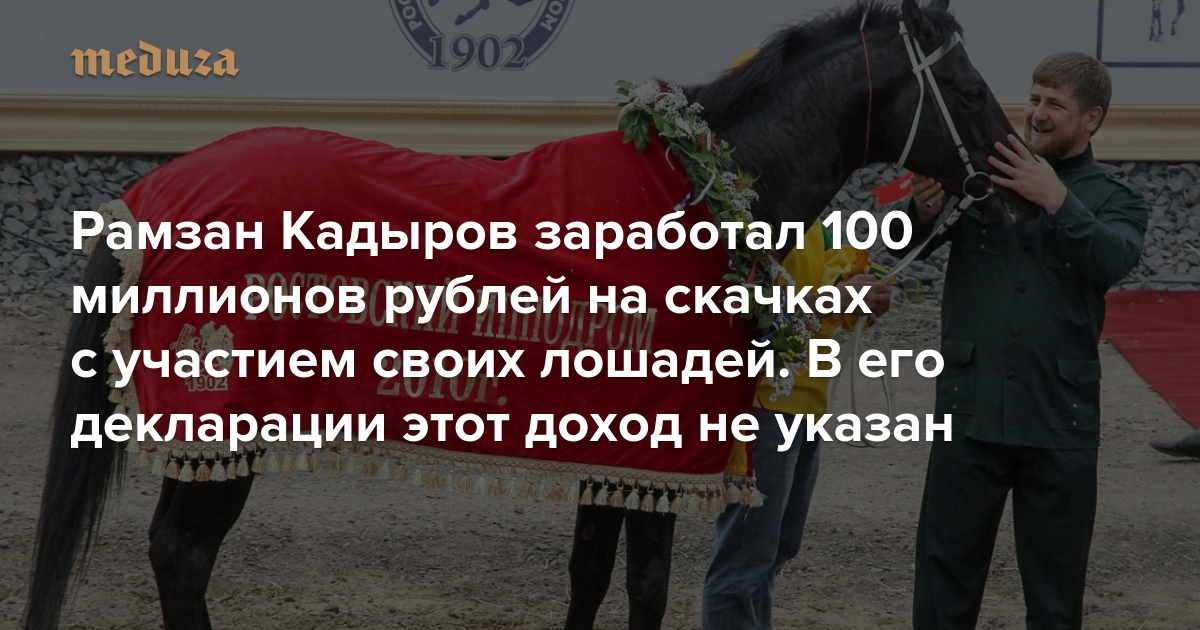 Глава Чечни Рамзан Кадыров владеет 128 скаковыми лошадьми. За последние четыре года доходы от их участия в скачках составили 98 миллионов рублей — это гораздо больше, чем официально заработал Кадыров. Но он не декларирует эти доходы, говорится в расследовании «Трансперенси Интернешнл».