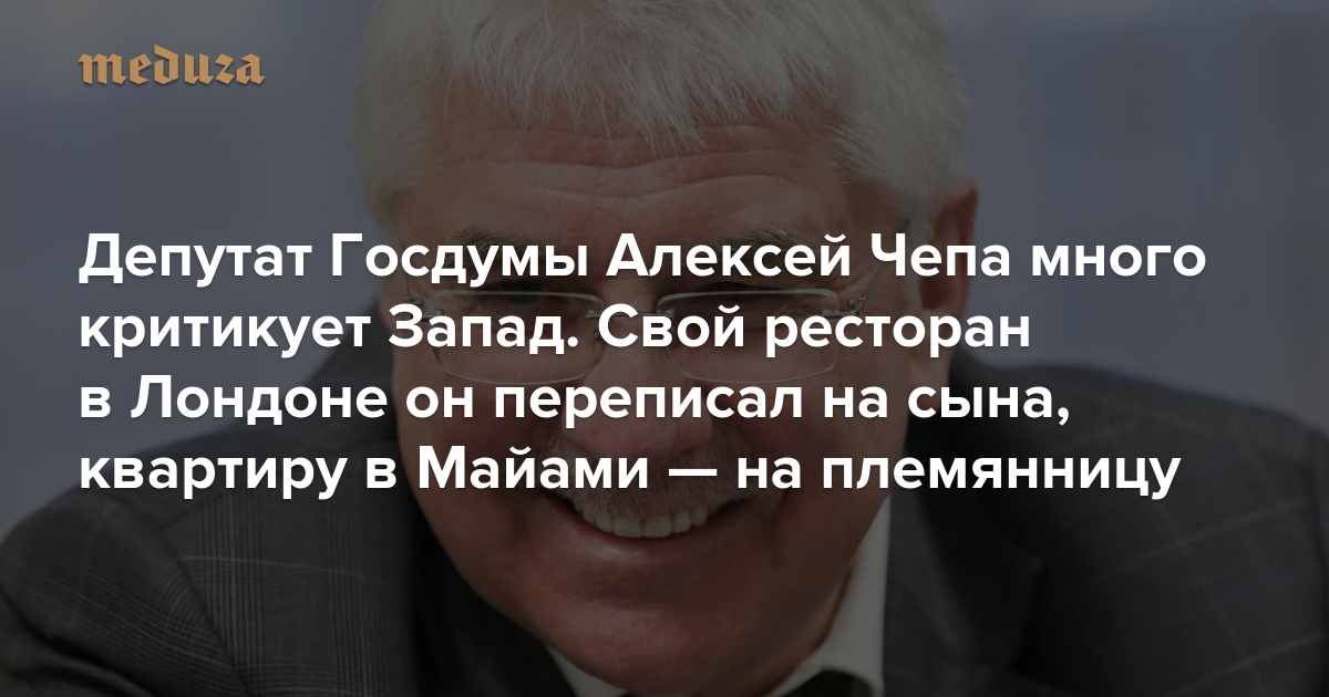 Депутат Госдумы Алексей Чепа много критикует Запад. Свой ресторан в Лондоне он переписал на сына, квартиру в Майами — на племянницу