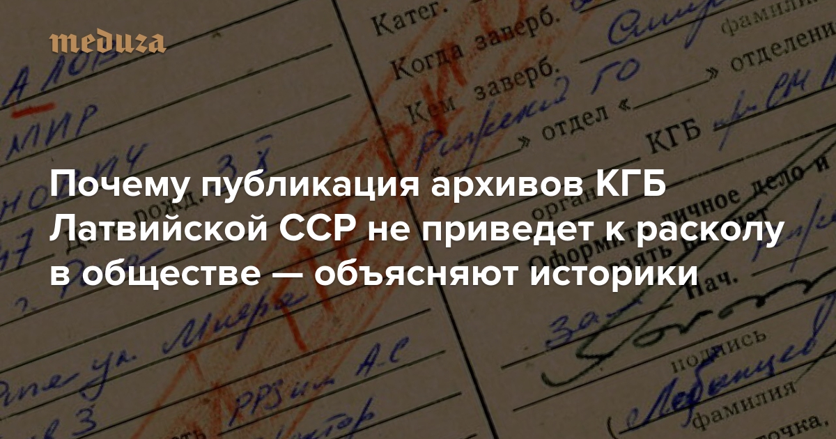 20 декабря Национальный архив Латвии начал публикацию картотеки КГБ Латвийской ССР. Всего опубликовано более 10 тысяч отсканированных карточек. В них содержатся данные об агентах и информаторах, работавших в КГБ в 1980-х годах, имена потенциальных кандидатов для вербовки, а также сведения о лицах, которые планировали выехать за границу. Как пишут латвийские СМИ, в опубликованных документах могут быть упомянуты несколько сотен известных людей; против публикации архива выступала полиция безопасности Латвии — из опасений, что из-за нее граждане станут менее охотно сотрудничать со спецслужбами. «Медуза» попросила латвийских историков рассказать об опубликованных документах.
