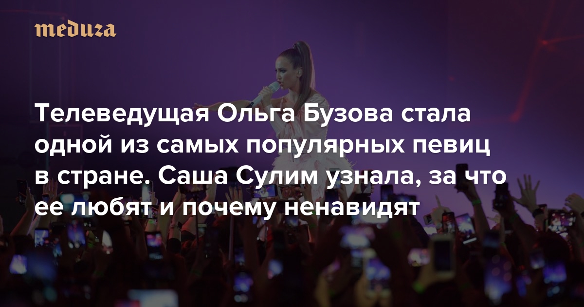 Пятнадцать лет назад петербургская студентка Ольга Бузова дебютировала в новом реалити-шоу «Дом-2». В 2019 году Бузова — одна из самых узнаваемых публичных фигур в стране: она ведет телепрограммы, владеет модными брендами и ресторанами, ведет инстаграм на 14 миллионов подписчиков, а в последние несколько лет стала еще и востребованной певицей. Во времена, когда слово «эстрада» перестало быть ругательством, а модные музыканты участвуют в телевизионных голубых огоньках, Бузова — поп-звезда старой формации: она выступает под фонограмму — а ненавидят ее примерно так же, как когда-то ненавидели «попсу». Спецкор «Медузы» Саша Сулим пыталась встретиться с Бузовой полтора года — а в итоге выяснила, кто и почему слушает певицу и чем объясняется ее удивительный успех.