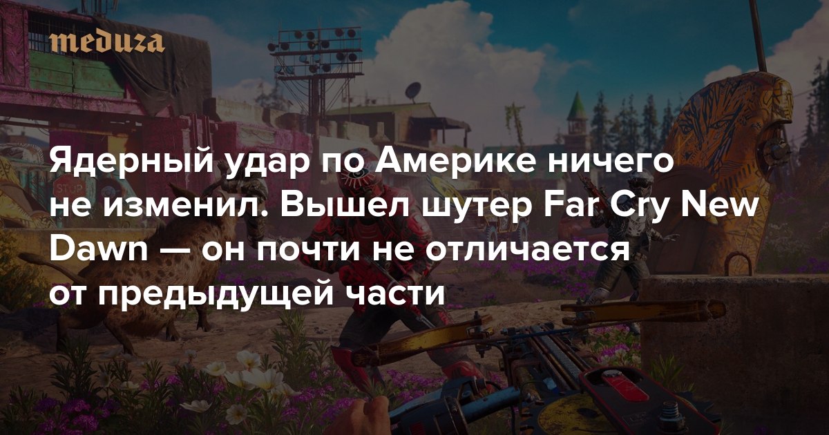 15 февраля на PC, PS4 и Xbox One выходит Far Cry New Dawn — шутер с открытым миром от французской студии Ubisoft, продолжающий сюжет пятой части сериала. Место действия осталось прежним — округ Хоуп (штат Монтана), преобразившийся после ядерного удара. Журналист «Медузы» Максим Иванов 20 часов гулял по нему с боевым кабаном, сражался с рейдерами и искал убежища «выживальщиков» — а теперь рассказывает о своих впечатлениях.