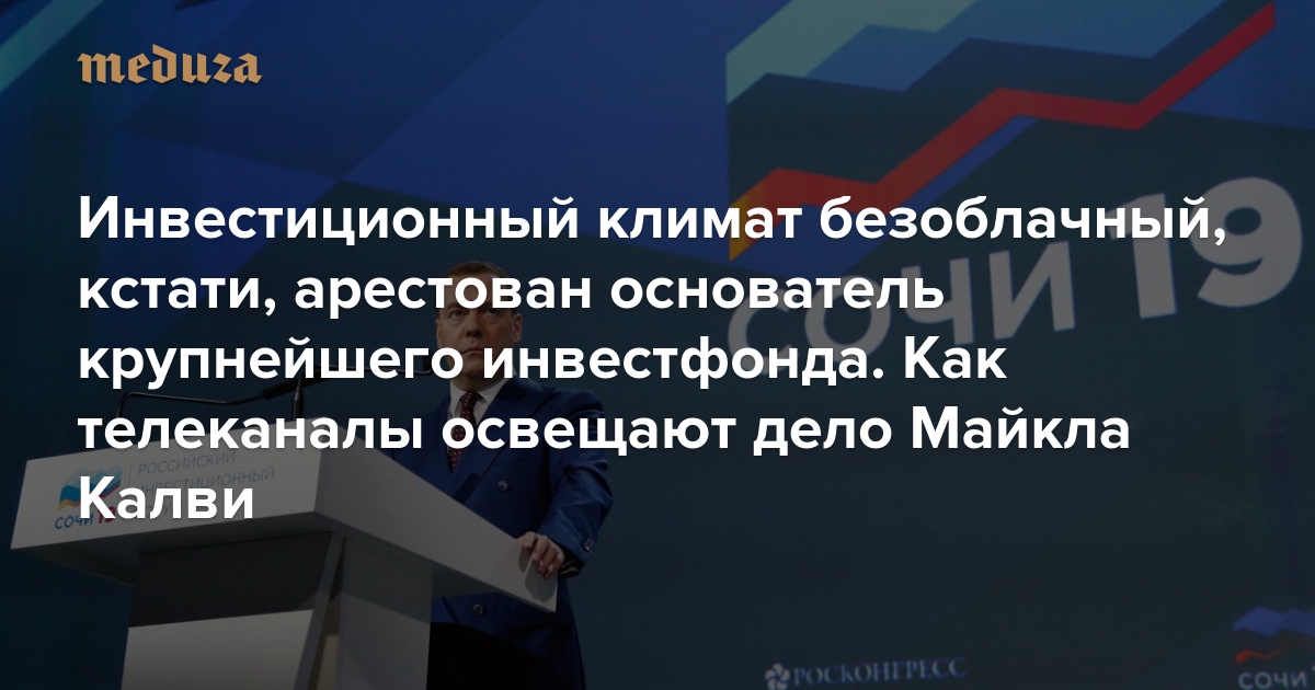 13 февраля в Сочи открылся традиционный Российский инвестиционный форум под эгидой правительства, который в разном формате проводится там с 2002 года. В последний день форума 15 февраля в Москве был задержан Майкл Калви — глава крупнейшего инвестиционного фонда Baring Vostok, который за 25 лет вложил в российские компании почти три миллиарда долларов. Федеральные телеканалы почти не заметили задержания и ареста Калви, рассказывая в первую очередь об успехах на инвестиционном форуме. Вот как освещали два этих события.