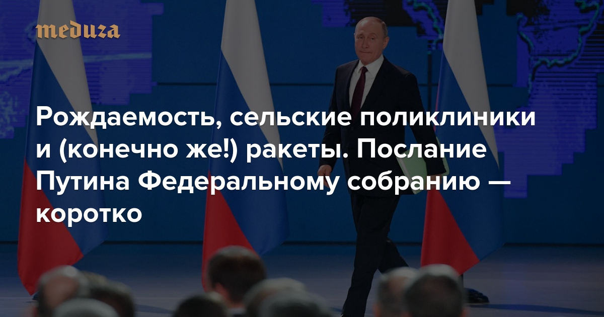 Президент России Владимир Путин выступил с очередным посланием Федеральному собранию. Целиком его можно посмотреть тут, а расшифровка скоро появится на сайте Кремля. «Медуза» коротко пересказывает главные тезисы полуторачасового послания (прямые цитаты даны в кавычках).