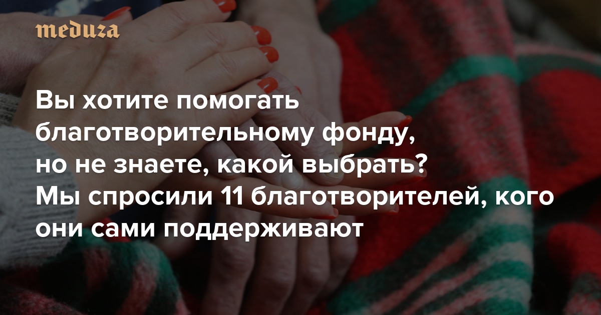Регулярные ежемесячные платежи делают благотворительность гораздо более эффективной. Подписаться практически на любой фонд можно или в личном кабинете клиента банка — или на сайте самой организации. Другой вопрос — как выбрать фонд, которому помогать? «Медуза» обратилась к 11 важным людям из благотворительности, чтобы узнать, кого посоветуют они сами.