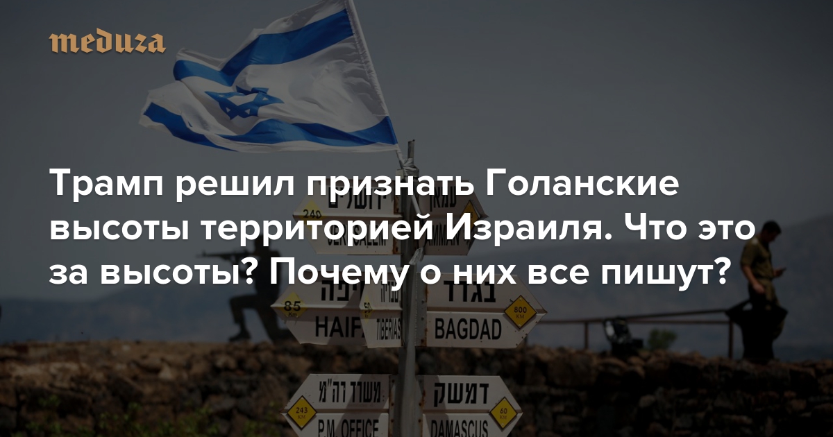 Президент США Дональд Трамп написал твит, в котором заявил, что настало время признать полноправный суверенитет Израиля над Голанскими высотами. До этого США, хотя и оставались главными союзниками Израиля на Ближнем Востоке, придерживались решений Совета безопасности ООН, который считает израильский контроль над Голанами незаконной оккупацией. «Медуза» рассказывает об истории этого конфликта и о том, что последует за решением Трампа.