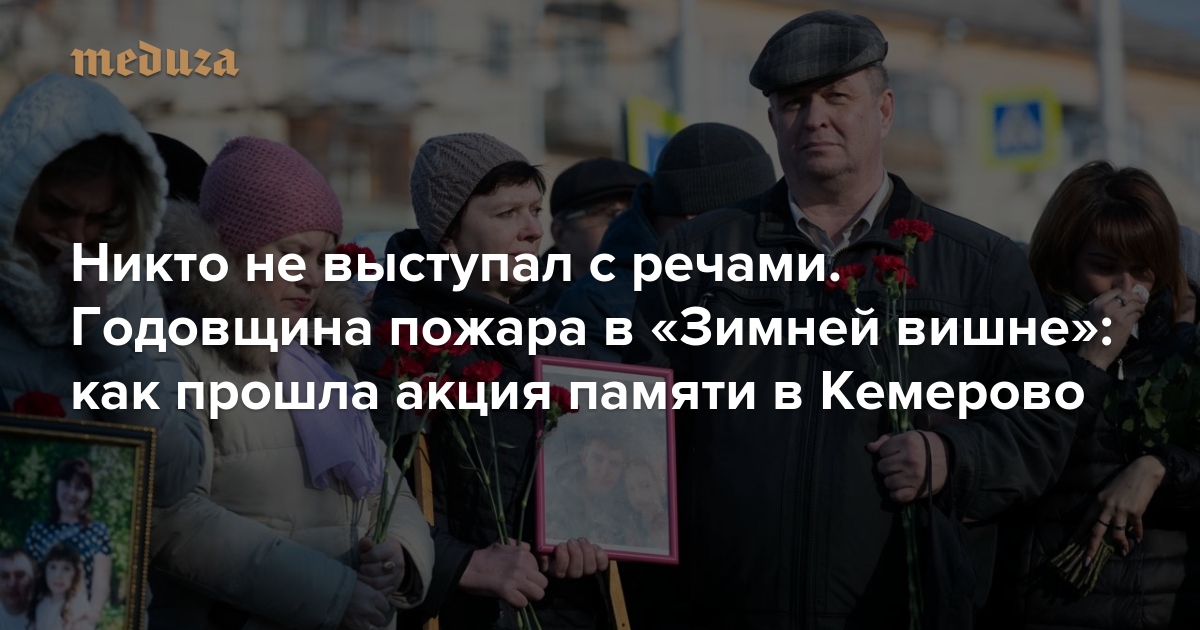 В первую годовщину пожара в «Зимней вишне», в котором погибли 60 человек, в том числе 37 детей, местные власти решили не проводить общегородскую траурную акцию. Вероятно, чтобы избежать повторения прошлогодних событий, когда на стихийных массовых митингах местные жители резко критиковали власти Кузбасса, на этот раз встречи официальных лиц и родственников проходят камерно, а возложение цветов к месту пожара широко не анонсировали. По просьбе «Медузы» к мемориальному камню, где утром собрались близкие погибших, сходил главный редактор кемеровского издания Vse42.ru Игорь Рожков.