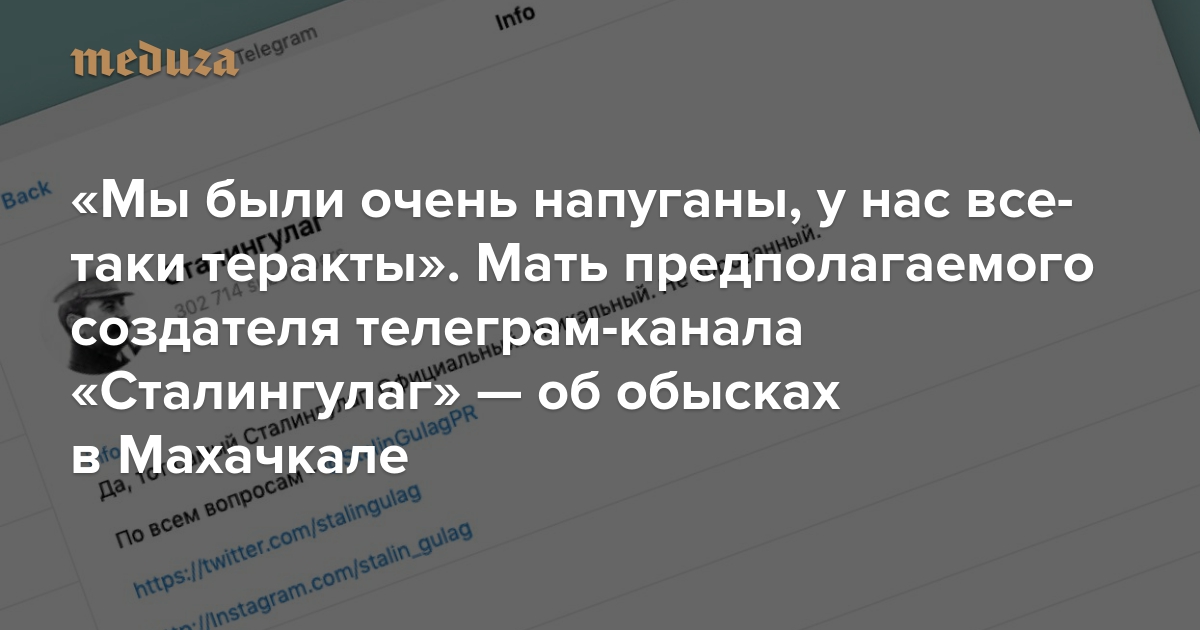 «Мы были очень напуганы, у нас все-таки теракты». Мать предполагаемого создателя телеграм-канала «Сталингулаг» — об обысках в Махачкале