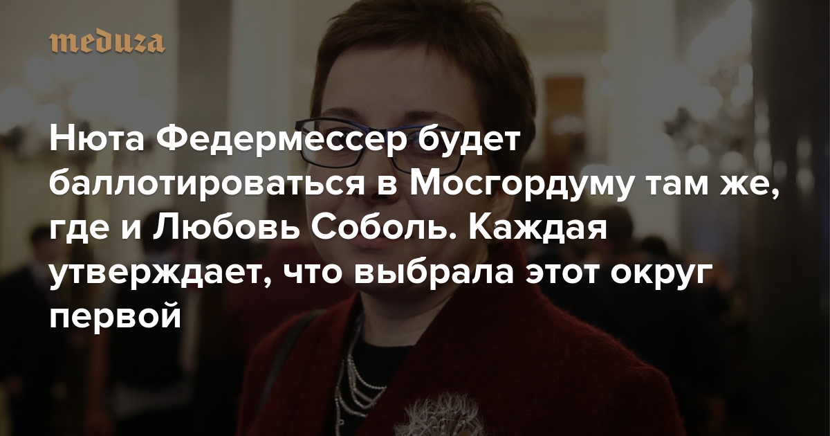 Еще в апреле «Медуза» писала, что Федермессер войдет в список кандидатов, которых на предстоящих выборах будет неформально поддерживать московская мэрия (столичное правительство планирует максимально обновить состав Мосгордумы). Источники «Медузы» называли и конкретный избирательный округ — 43-й, в который входят Пресненский район, а также Арбат и Хамовники. Помимо нее там собирается выдвигаться юрист Фонда борьбы с коррупцией Любовь Соболь, активно занимающаяся в последние месяцы расследованиями о поставках некачественной еды в московские школы, а также еще один оппозиционер — бывший глава московского «Яблока» Сергей Митрохин.