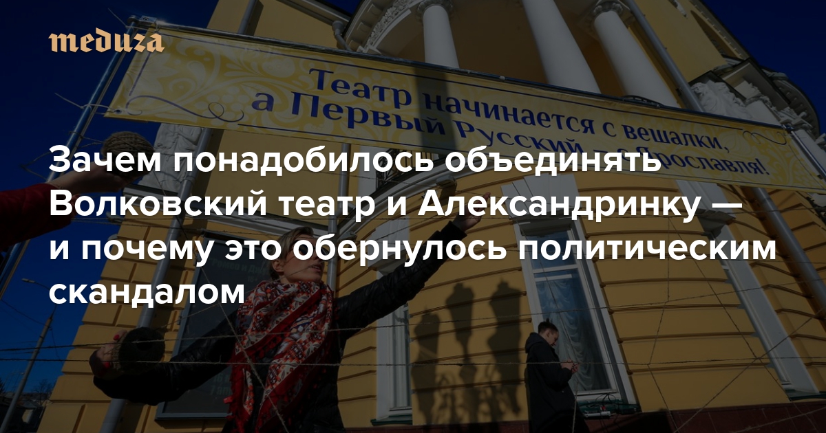 В конце марта министр культуры Владимир Мединский объявил об объединении двух старейших театров России — Волковского в Ярославле и Александринского в Петербурге — в единый национальный театр. Минкульт отмечал, что инициатива исходит от руководителей самих театров — Евгения Марчелли и Валерия Фокина. Эта идея не понравилась Союзу театральных деятелей, а также многим в Ярославле — ни местным политикам, ни общественникам. К числу противников подключился и председатель правительства Дмитрий Медведев: он приостановил объединение. Худрук Евгений Марчелли, желавший союза с Александринкой, теперь конфликтует с директором собственного театра; более того, в мае деятельность Марчелли начала проверять Ярославская прокуратура. Специальный корреспондент «Медузы» Андрей Перцев рассказывает, зачем ярославский театр захотел объединяться с петербургским — и почему конфликт из театральную плоскости перешел в политическую.