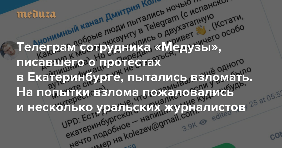 Телеграм сотрудника «Медузы», писавшего о протестах в Екатеринбурге, пытались взломать. На попытки взлома пожаловались и несколько уральских журналистов