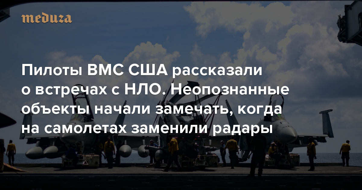 Газета The New York Times поговорила с несколькими пилотами американских ВМС, которые во время полетов у восточного побережья США встречали неопознанные летающие объекты. Американские журналисты уже писали про военную «Программу по расширенному опознаванию воздушных угроз», в рамках которой изучали похожие инциденты («Медуза» пересказывала эти публикации). Сообщалось, что программа была закрыта, однако, как пишет The New York Times, она продолжает существовать «в других формах».