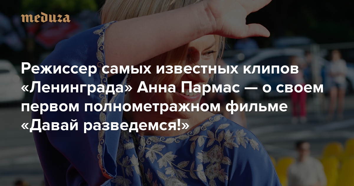 12 июня на «Кинотавре» состоится премьера дебютного фильма Анны Пармас «Давай разведемся!», главную роль в котором сыграла Анна Михалкова. До своей первой полнометражной картины Пармас написала сценарии для нескольких телешоу («Осторожно, модерн!») и фильмов («Кококо», «История одного назначения») — и сняла самые вирусные клипы группе «Ленинград»: «Экспонат», «Экстаз», «ЗОЖ», «В Питере — пить». «Медуза» обсудила с режиссером работу с Сергеем Шнуровым и Авдотьей Смирновой, а также героинь средних лет и реалистичные хеппи-энды.