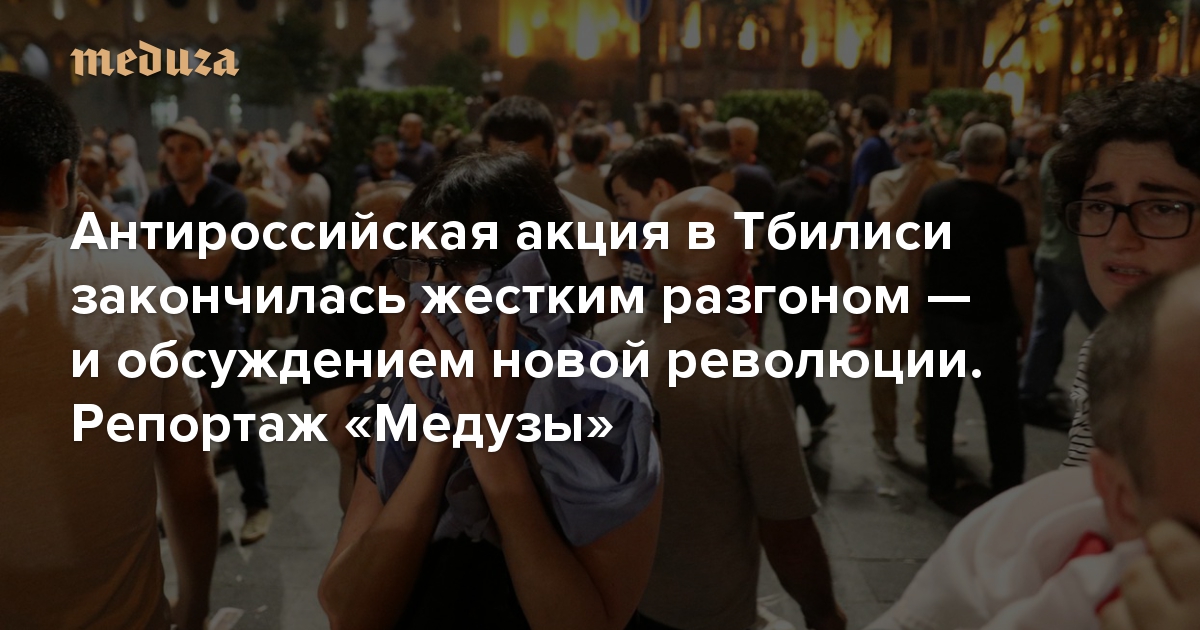 Вечером 20 июня на проспекте Руставели в Тбилиси возле грузинского парламента собрались по меньшей мере десять тысяч человек — они не уходили до середины ночи. Поводом для волнений стало выступление в парламенте депутата Госдумы Сергея Гаврилова: он занял кресло спикера и говорил по-русски; его речь прервали оппозиционеры. Митингующие на Руставели жгли российские флаги и называли Россию оккупантом. Полиция жестко — с применением слезоточивого газа и резиновых пуль — разогнала толпу, пытавшуюся захватить парламент. Сотни человек, в том числе полицейские, пострадали. По просьбе «Медузы» журналистка Мария Лацинская рассказывает, что происходило в Тбилиси этой ночью — и как протестующие дошли до обсуждения новой революции.