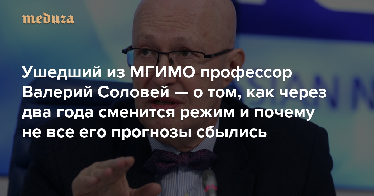 Политолог и доктор исторических наук Валерий Соловей покинул пост профессора кафедры связей с общественностью МГИМО. Как он сам говорит — «по политическим причинам». Неофициально об этом стало известно еще в конце мая, а 19 июня Соловей рассказал об этом в фейсбуке. В МГИМО уход политолога прокомментировали сдержанно. Во многих своих выступлениях Валерий Соловей не раз давал прогнозы о грядущих радикальных изменениях в России — вроде досрочного ухода Владимира Путина с поста президента, массовых протестов национального масштаба, ограничения россиянам выезда за границу. «Медуза» поговорила с Валерием Соловьем о его отставке и его прогнозах, включая последний — о революции в России 2020 года.