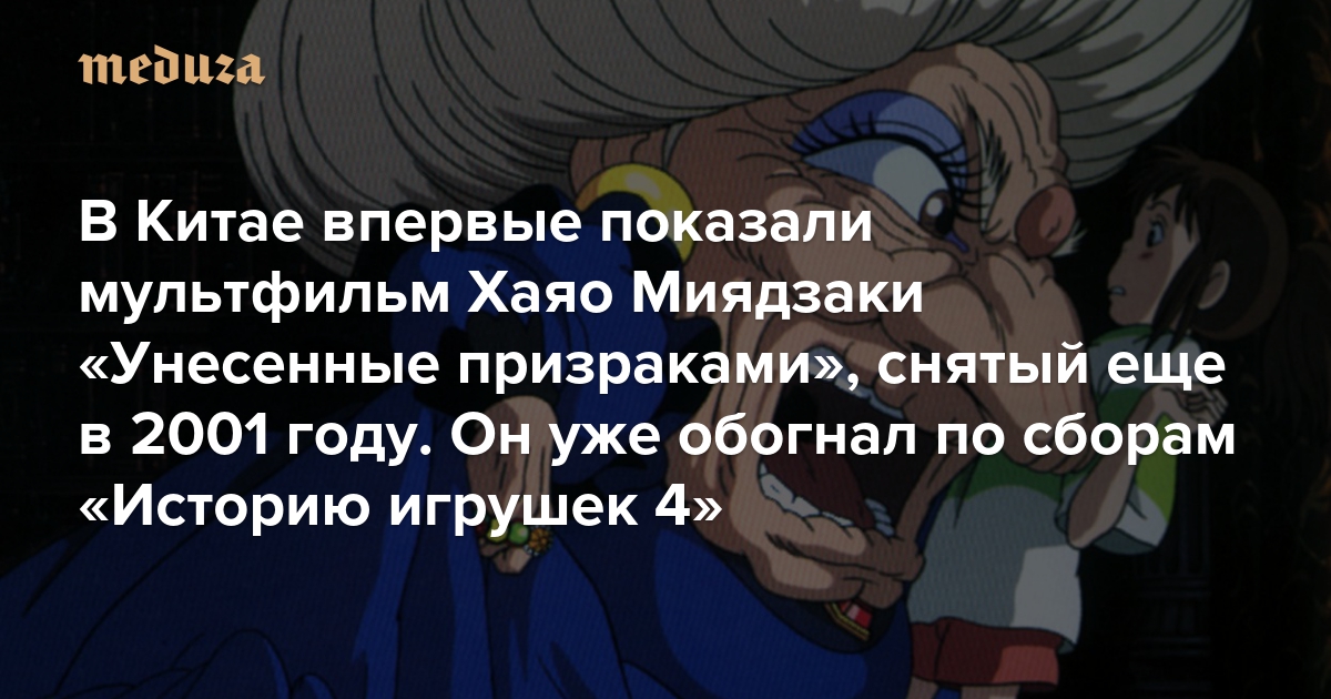 Мультфильм «Унесенные призраками» — классическое аниме Хаяо Миядзаки о девочке, оказавшейся в фантастическом мире, — вышел на китайские экраны 21 июня 2019 года. Это была премьера: картину, вышедшую в 2001 году, за последние 18 лет показали в прокате разных стран 85 раз (из них восемь раз в США, три — в Германии, три — в России, один раз в Японии и один раз в Гонконге), но Китай в этот список не входил. Из 28 картин Миядзаки в Китае вышли только три: «Небесный замок Лапута» в 1992-м, «Принцесса Мононоке» в 1997-м и «Мой сосед Тоторо» — в 2018-м, спустя двадцать лет после премьеры в Японии. «Ходячий замок», «Рыбку Поньо на утесе» и «Ветер крепчает» в китайских кинотеатрах не показывали.