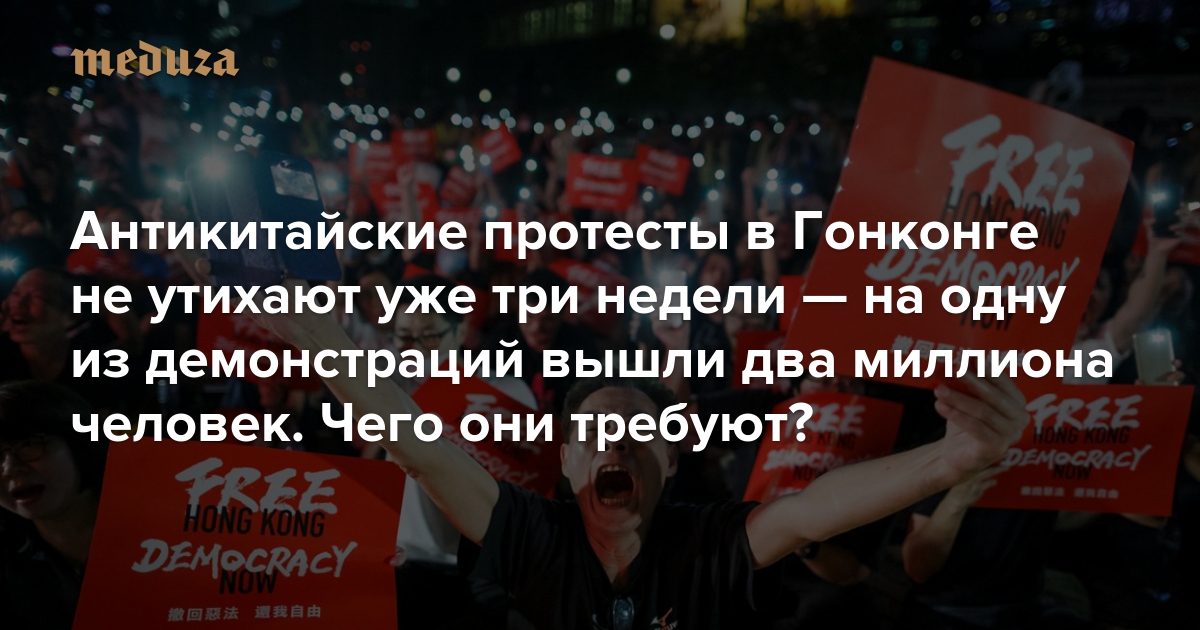 Антикитайские протесты в Гонконге не утихают уже три недели — на одну из демонстраций вышли два миллиона человек. Чего они требуют?