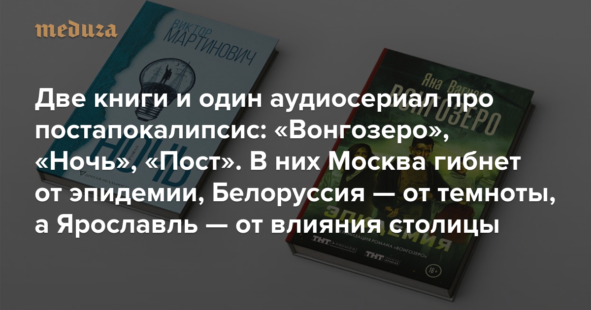 Две книги и один аудиосериал про постапокалипсис: «Вонгозеро», «Ночь», «Пост» В них Москва гибнет от эпидемии, Белоруссия — от темноты, а Ярославль — от влияния столицы