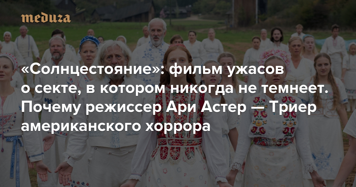 18 июля в российский прокат выходит хоррор Ари Астера «Солнцестояние». В нем друзья-американцы попадают в шведскую секту, празднующую наступление белых ночей. Выбраться из места, где при ярком свете дня проходят жестокие ритуалы, оказывается не так просто. Кинокритик «Медузы» Антон Долин объясняет, чем работа Астера напоминает фильмы Ларса фон Триера и почему эта картина вслед за ужасами Джордана Пила говорит о возрождении жанра.