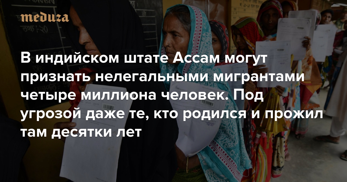 В конце июля несколько миллионов жителей индийского штата Ассам, скорее всего, будут объявлены людьми, не имеющими гражданства Индии. 31-го числа власти должны обнародовать окончательный вариант Национального регистра граждан (NRC), куда, судя по предварительным версиям, рискуют не попасть около четырех миллионов человек — из почти 33 миллионов жителей штата. Правящая партия Индии хочет распространить такую практику на другие регионы.