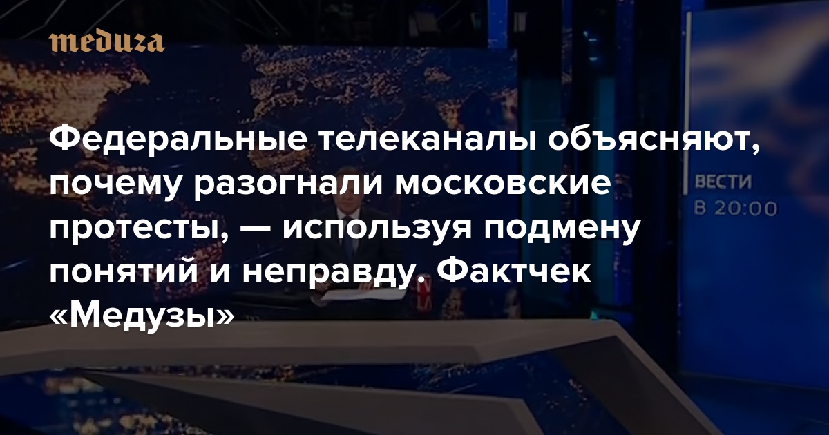 Федеральные телеканалы объясняют, почему разогнали московские протесты, — используя подмену понятий и неправду. Фактчек «Медузы»