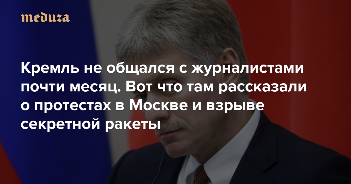 13 августа пресс-секретарь президента России Дмитрий Песков впервые почти за месяц провел конференц-колл с журналистами. Из-за отпуска Пескова ежедневные беседы не проводились с 18 июля, поэтому ему задали вопросы сразу обо всех главных событиях последних недель: выборах в Мосгордуму, связанных с этим протестах, взрыве ракеты в Белом море. Вот что он ответил.