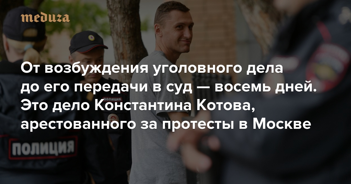20 августа Следственный комитет объявил, что дело Константина Котова, обвиняемого по «дадинской» статье, передано в суд. Ранее адвокат Котова Мария Эйсмонт рассказывала, что дело в отношении ее подзащитного было возбуждено 12 августа, тогда же Котова задержали. Уже 15 августа адвокату сообщили, что расследование дела завершено. За три дня следователи ни разу его не допросили. «Медуза» рассказывает, как следствие описывает действия Котова, которые легли в основу обвинения, и как за три дня оформили уголовное дело.