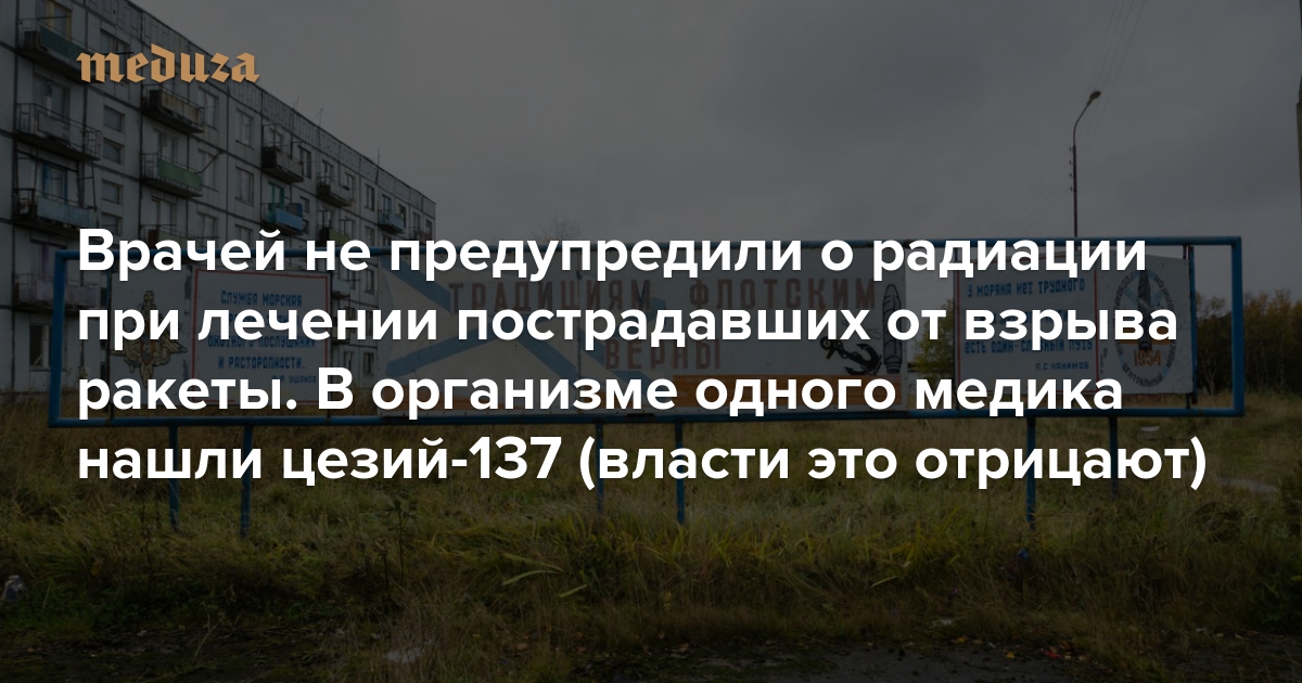 У врача Архангельской областной больницы, лечившего пострадавших при взрыве ракеты 8 августа, обнаружили в мышечной ткани радиоактивный нуклид цезий-137. Об этом сообщает The Moscow Times, ссылаясь на слова источников в медицинских кругах. Пострадавший врач отказался общаться с журналистами — все сотрудники больницы, контактировавшие с ранеными при взрыве, по требованию ФСБ подписали документы о неразглашении.