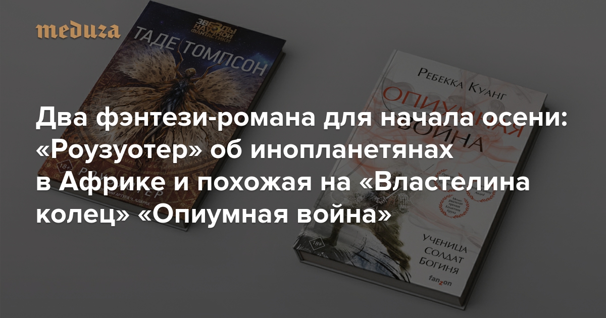 Литературный критик «Медузы» Галина Юзефович рассказывает о двух фэнтези-романах: «Опиумной войне» Ребекки Куанг и «Роузуотере» Таде Томпсона. Первый напоминает набор удачно скроенных штампов из «Гарри Поттера» и «Властелина колец», его действие происходит в вымышленной восточной стране. Во втором — город в нигерийской саванне противостоит инопланетным существам.