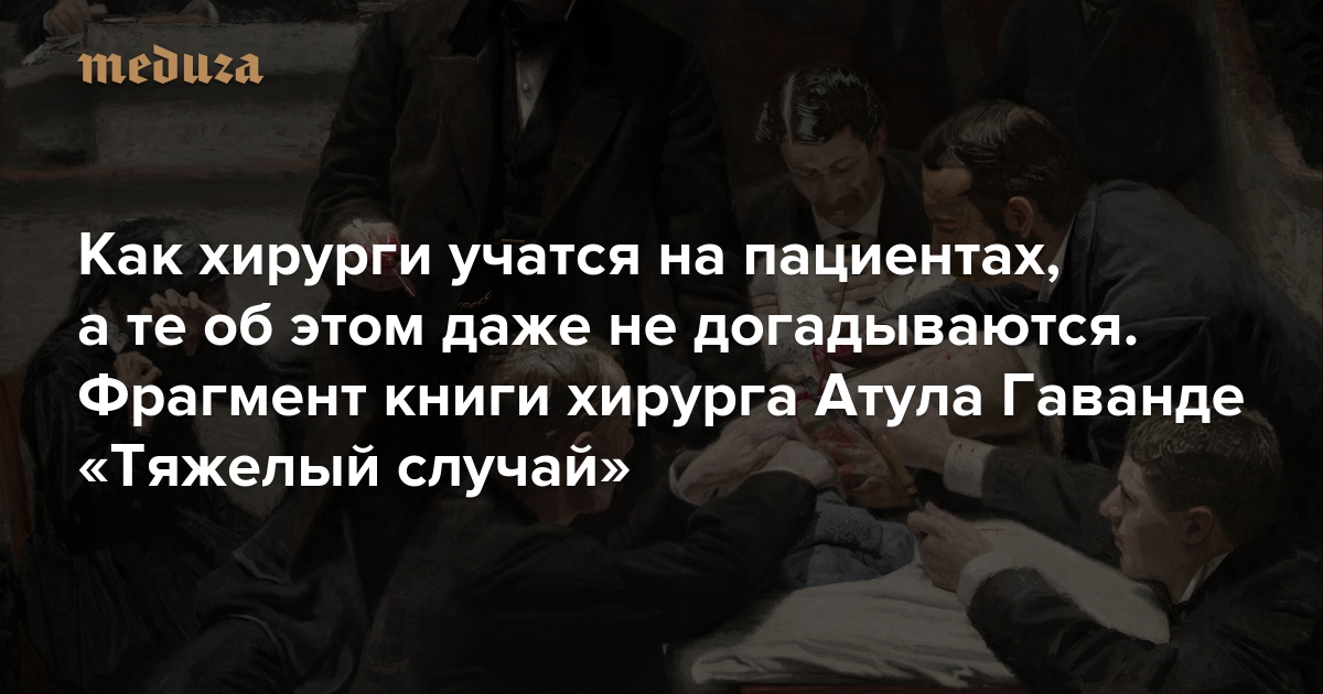 В конце августа в издательстве «Альпина нон-фикшн» вышла книга американского хирурга и журналиста Атула Гаванде «Тяжелый случай. Записки хирурга». Она о том, как много в медицине неопределенности и недопонимания, как сложно сделать выбор, почему врачи не всегда честны с пациентами и почему плохие врачи практикуют долгие годы, несмотря на то, что коллеги все видят. «Медуза» публикует фрагмент книги о том, как в действительности учатся хирурги (возможно, на вас, но вы об этом не узнаете).