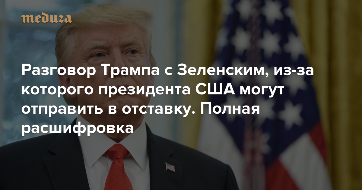 Администрация президента США опубликовала стенограмму телефонного разговора президента США Дональда Трампа и президента Украины Владимира Зеленского, состоявшегося 25 июля. Из-за этого разговора Трампу грозит импичмент: его подозревают в попытке надавить на Зеленского, чтобы заставить активизировать расследование в отношении сына Джо Байдена на Украине. В опубликованной стенограмме отмечается, что это не дословная расшифровка разговора Трампа и Зеленского. «Медуза» публикует перевод этого документа.