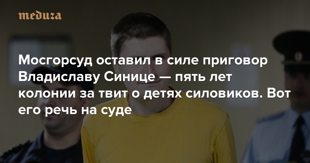 «Противно осознавать, что наша страна живет в Средневековье» Мосгорсуд оставил в силе приговор Владиславу Синице — пять лет колонии за твит о детях силовиков. Вот его речь на суде