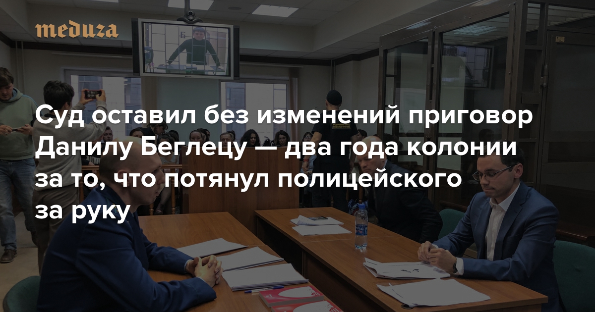 7 октября Московский городской суд рассмотрел апелляционную жалобу адвокатов Данилы Беглеца. Больше месяца назад Тверской районный суд приговорил 26-летнего предпринимателя к двум годам колонии за то, что он «схватил за запястье правой руки» командира отделения взвода полиции Никитина и «сильно сдавив, отдернул в сторону, тем самым причинив физическую боль». Изначально Беглец говорил о своей невиновности, но по совету адвокатов согласился на «особый порядок» рассмотрения дела и признался в совершении преступления. Несмотря на доводы адвокатов, поддержку других фигурантов «московского дела» и слезы матери, приговор Беглецу не смягчили. Спецкор «Медузы» Кристина Сафонова наблюдала за заседанием.