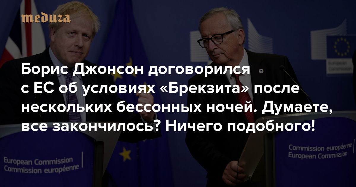 К моменту публикации статьи «Медузы» новый вариант договора еще не был опубликован. В одном Джонсон оказался прав: и затягивание «Брекзита», и угроза выхода Великобритании без сделки вызывает тревогу не только у многих его сограждан, но и у европейских политиков, которые оказались готовы к переговорам, — хотя ранее заявляли, что не отойдут от главных условий соглашения, подписанного год назад с Терезой Мэй.