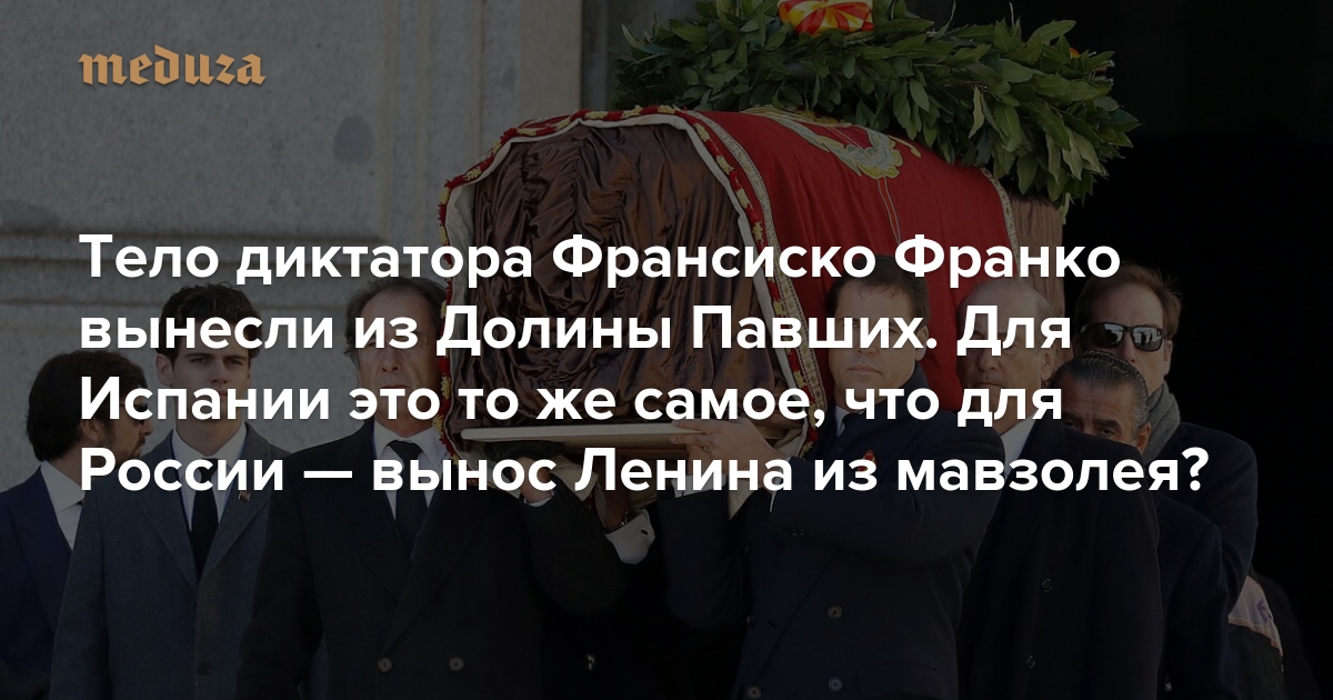 В Испании перезахоронили бывшего диктатора Франсиско Франко, который был у власти почти 40 лет. Гроб с его останками перенесли из Долины Павших на кладбище Мингоррубио, где покоится жена политика. Решение о перезахоронении в 2018 году приняло левое правительство Педро Санчеса, после чего родственники Франко больше года оспаривали его в судебном порядке. Точку в этом споре 30 сентября 2019-го поставил Верховный суд Испании, который разрешил приступить к подготовке перезахоронения. «Медуза» попросила научного сотрудника Института всеобщей истории РАН, кандидата исторических наук Георгия Филатова объяснить масштаб этого события — и можно ли его сравнить с возможным выносом из кремлевского мавзолея тела Владимира Ленина.