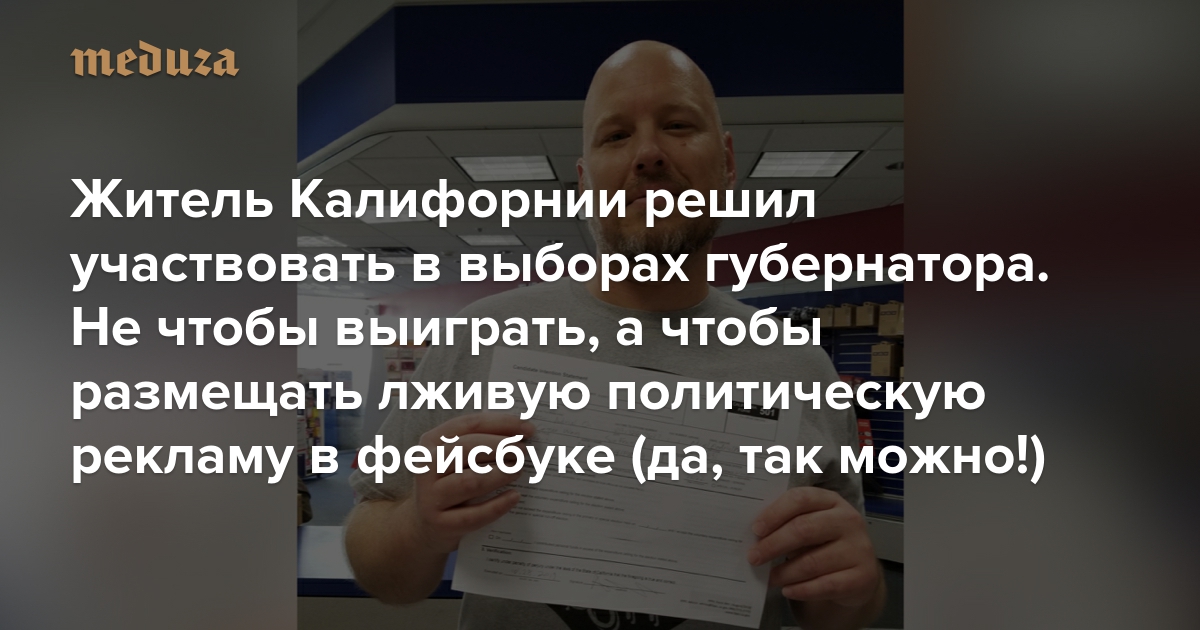 Житель Калифорнии решил участвовать в выборах губернатора. Не чтобы выиграть, а чтобы размещать лживую политическую рекламу в фейсбуке (да, так можно!)