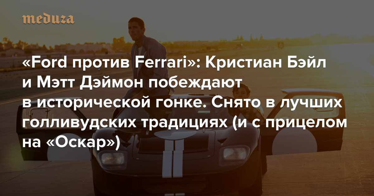 В прокат вышел фильм «Ford против Ferrari» — о знаменитой гонке 1966 года в Ле-Мане, в которой соревновались американская и итальянская команды. Победу Ford принесли конструктор Кэрролл Шелби (Мэтт Дэймон) и британский гонщик Кен Майлз (в очередной раз экстремально похудевший Кристиан Бэйл). Кинокритик «Медузы» Антон Долин считает, что этот фильм увлечет даже тех, кто ничего не понимает в автогонках. А еще он, вероятно, поборется за премию «Оскар».