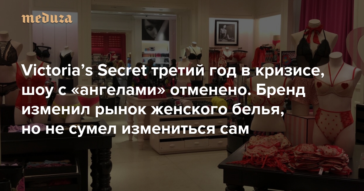Американский производитель женского белья Victoriaʼs Secret впервые с 1995 года отменил показ Victoriaʼs Secret Fashion Show. Компания L Brands — владелец Victoriaʼs Secret — объяснила, что намерена изменить позиционирование бренда, который в последние годы терял популярность и демонстрировал снижение продаж. Victoriaʼs Secret ругали за устаревший подход: бренд продолжал выпускать откровенно сексуальное белье и рекламировать его на моделях с идеальными телами, пока молодые марки выводили на рынок современные базовые комплекты, расширяли линейку размеров и привлекали к рекламе женщин разного веса и возраста. «Медуза» рассказывает, как Victoriaʼs Secret изменил американский рынок женского белья — и как спустя 40 лет не успел измениться сам.