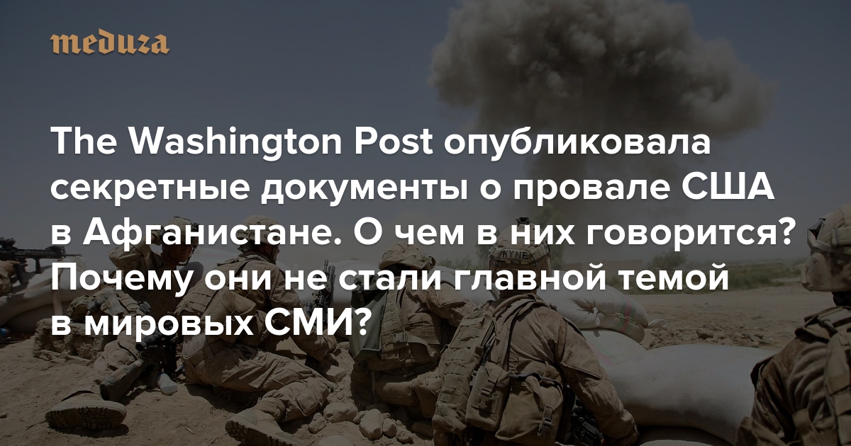 Прошло две недели, как газета The Washington Post опубликовала документы, которые назвала «секретной историей войны в Афганистане», но они так и не стали главной темой обсуждения в США и в мире. «Афганский архив» составлен на основе показаний, которые чиновники и военные дали специальной комиссии по восстановлению Афганистана. Армия США вторглась в эту страну в 2001 году, вскоре после терактов 11 сентября, но до сих пор не смогла справиться с исламистским движением «Талибан». Документы демонстрируют, что у американского руководства с самого начала не было единой стратегии, администрации Джорджа Буша — младшего и Барака Обамы манипулировали информацией для общественности, а победа так и не стала ближе. «Медуза» рассказывает об истории досье, его содержании — и о том, почему оно привлекло к себе не так много внимания, как можно было ожидать.