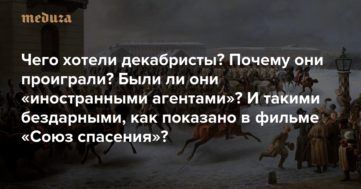 26 декабря (14-го по старому стилю) 1825 года в Санкт-Петербурге произошло вооруженное выступление заговорщиков, которые хотели не допустить к власти нового императора Николая I, а потом провести в России конституционные реформы по западному образцу. Эти события вошли в историю как восстание декабристов, которое закончилось поражением. К годовщине приурочен выход на экраны блокбастера «Союз спасения», создатели которого держатся явно не лестного мнения о восставших и не очень хотят разбираться в их мотивах. «Медуза» попросила кандидата исторических наук Леонида Ляшенко рассказать, чего на самом деле добивались декабристы, пользовались ли они поддержкой в обществе и собирались ли убивать царя.