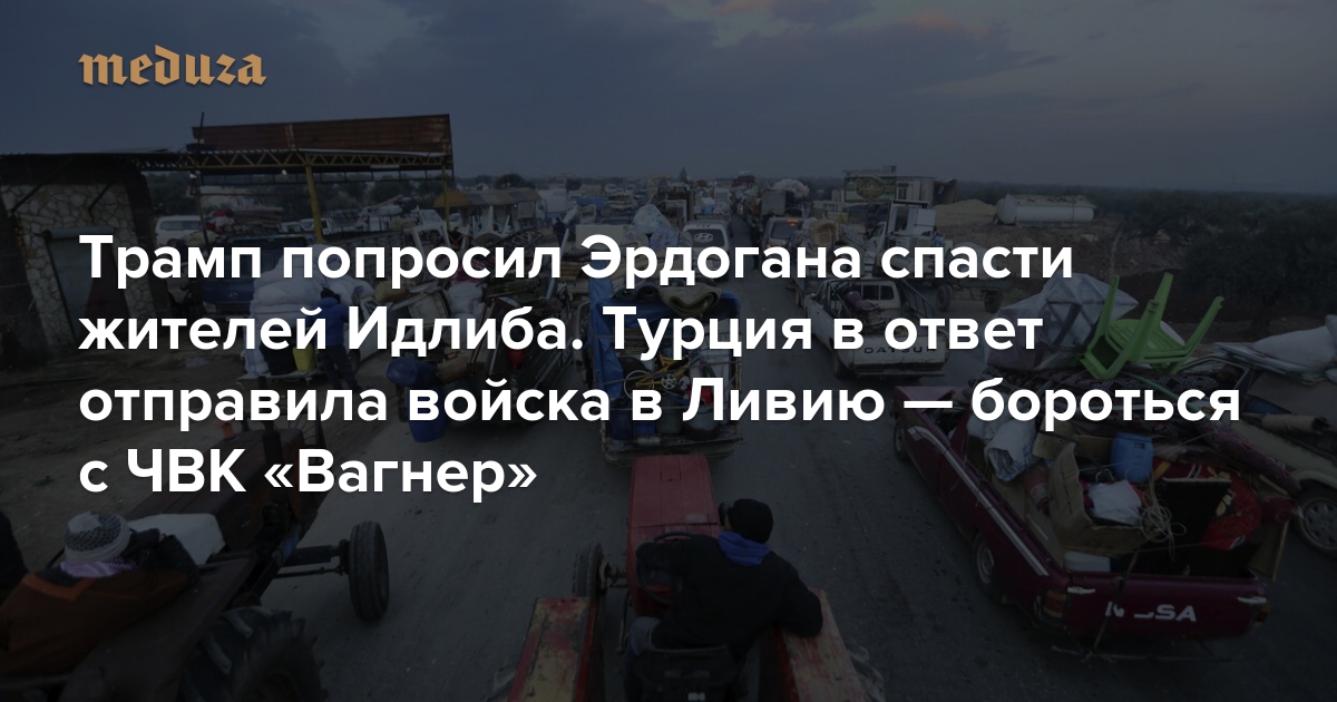 Президент США Дональд Трамп написал твит, в котором обвинил Сирию, Россию и Иран в том, что они убивают тысячи мирных жителей в сирийской провинции Идлиб. Одновременно Трамп потребовал, чтобы с этим разобралась Турция. 28 декабря поступили сообщения, что Турция не спасает мирных жителей Идлиба. Вместо этого она перебрасывает подконтрольные ей отряды сирийской оппозиции за тысячу километров на другой берег Средиземного моря — в Ливию, где тоже прямо сейчас идет война. «Медуза» объясняет, как бои в Идлибе связаны с боями в Ливии и чем это все может закончиться.